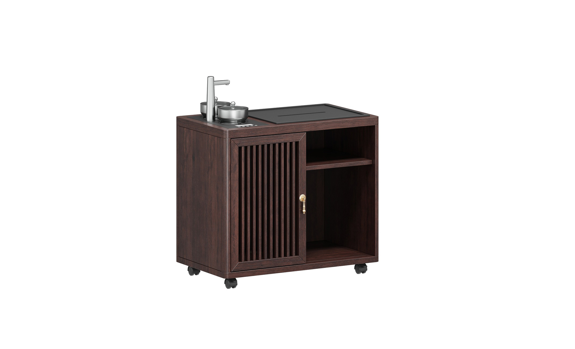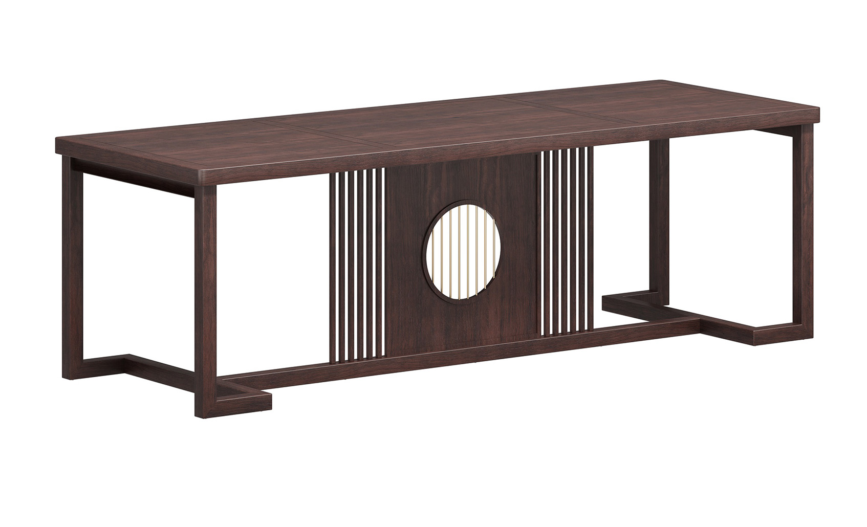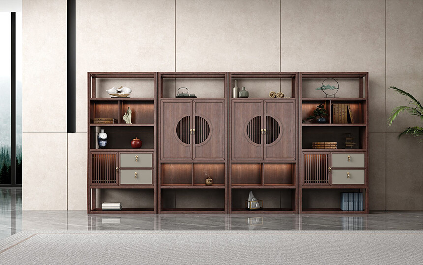 擋板圓型設(shè)計(jì),金銅件裝飾,銅木結(jié)合,鏤空豎條元素的原木柵格設(shè)計(jì),凸顯中式與現(xiàn)代的融合韻味。