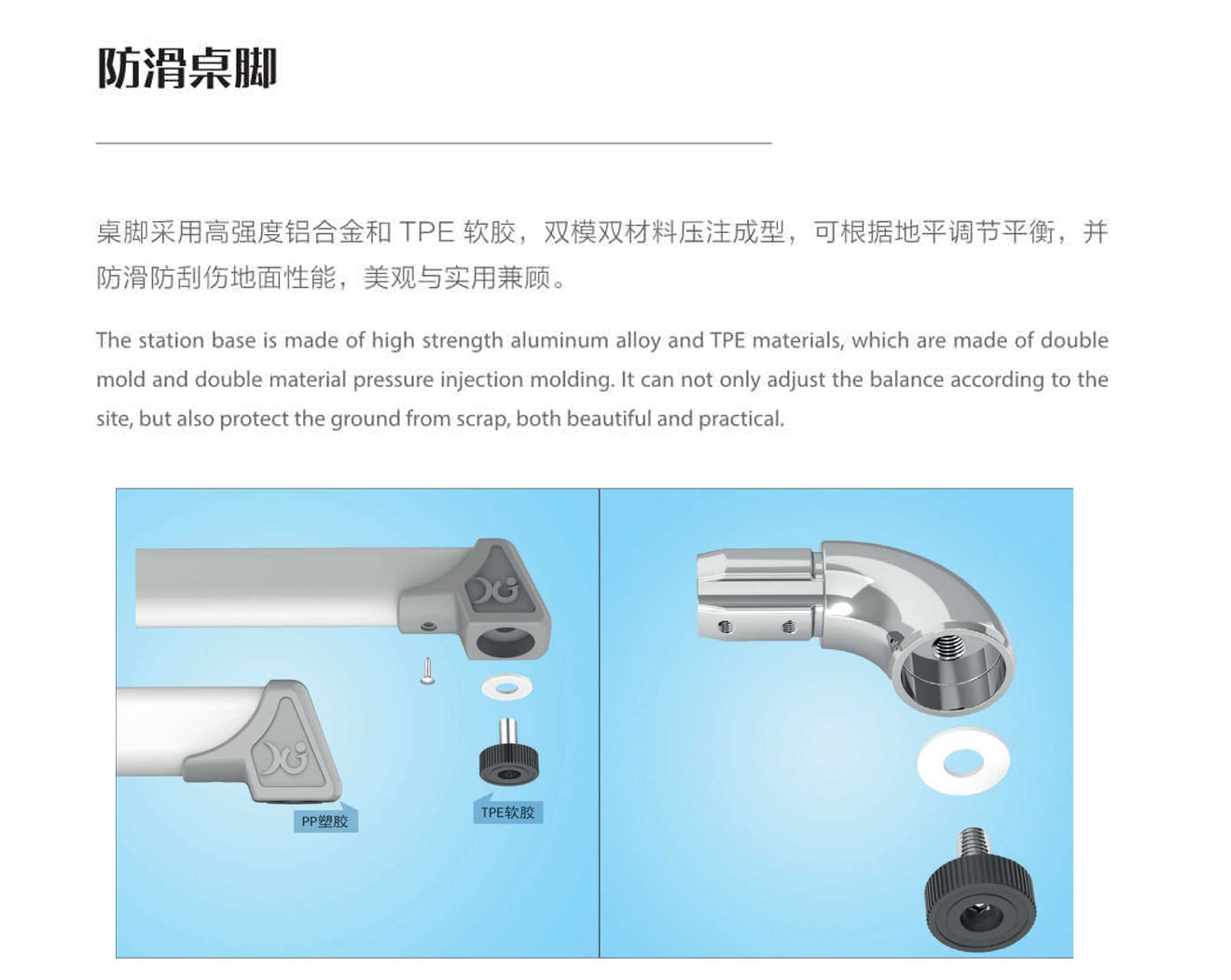 5.桌腳掌:1.5mm壁厚,腳套底有4個平衡調(diào)節(jié)機構。