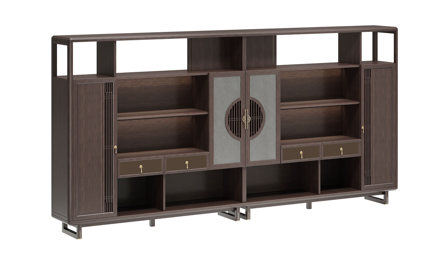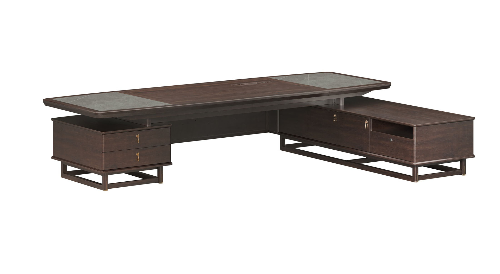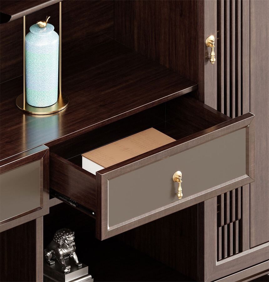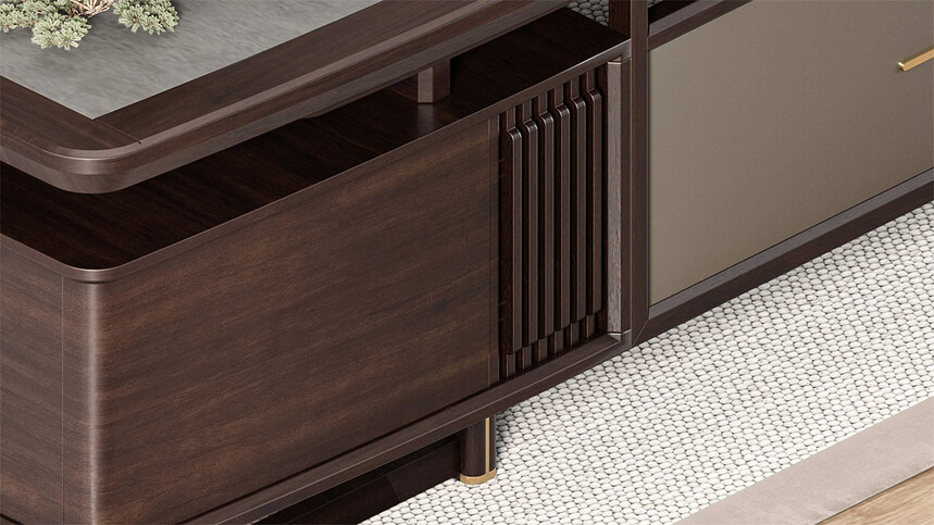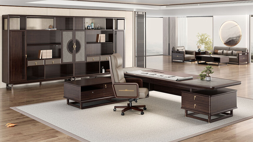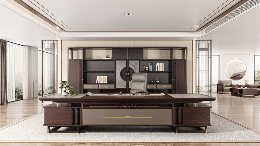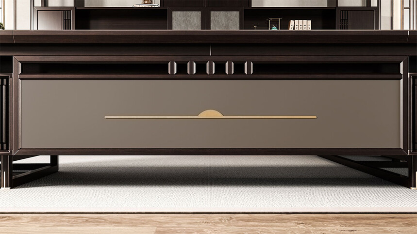鴻泰系列是一款新中式風(fēng)格的辦公家具,設(shè)計靈感源于中式傳統(tǒng)裝飾紋樣“回”字形,因其形式回環(huán)反復(fù),延綿不斷,在民間有“富貴不斷頭”的說法,有連綿不斷、吉利長久的吉祥寓意,在造型上主要采用硬朗簡潔的直線條,溫潤的烏金木與質(zhì)樸的巖板相結(jié)合,剛?cè)岵?jì),時尚大方,既使得中式家具古典、質(zhì)樸的內(nèi)涵顯現(xiàn),又符合現(xiàn)代辦公追求的時尚感、實用性。