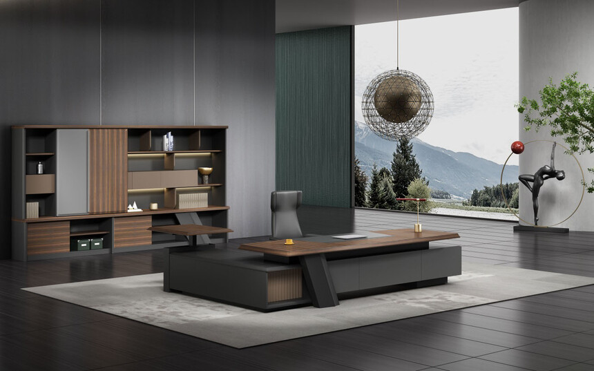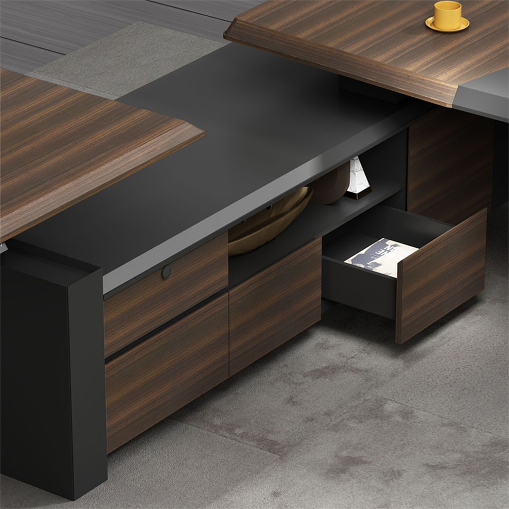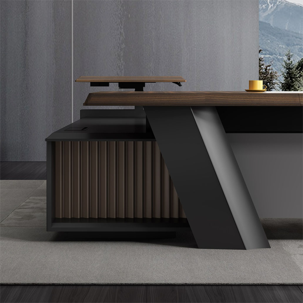 浩韻系列 深邃神秘,時尚富有魅力。態(tài)勢沉穩(wěn)又不失靈動,富有個性而不張揚。設(shè)計靈感源于建筑的傾斜式支撐給人帶來的沖擊感。不同材質(zhì)的相互碰撞,實木結(jié)合金屬嵌件,充滿現(xiàn)代氣息。在現(xiàn)有的辦公功能上結(jié)合隱藏的電動升降臺,將科技與美學(xué)完美結(jié)合,打造時尚簡潔的現(xiàn)代化辦公空間。